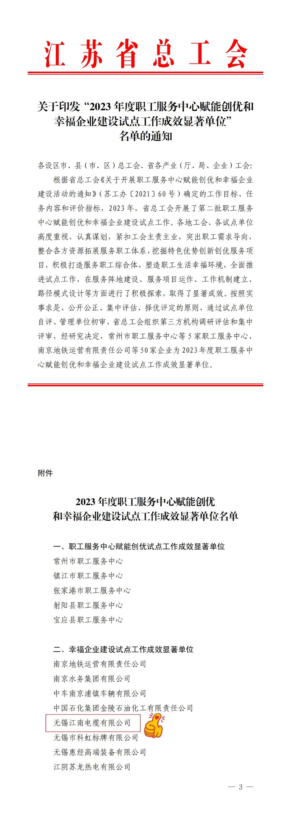 【喜报】江南电缆获评江苏省幸福企业建设试点工作成效显著单位!