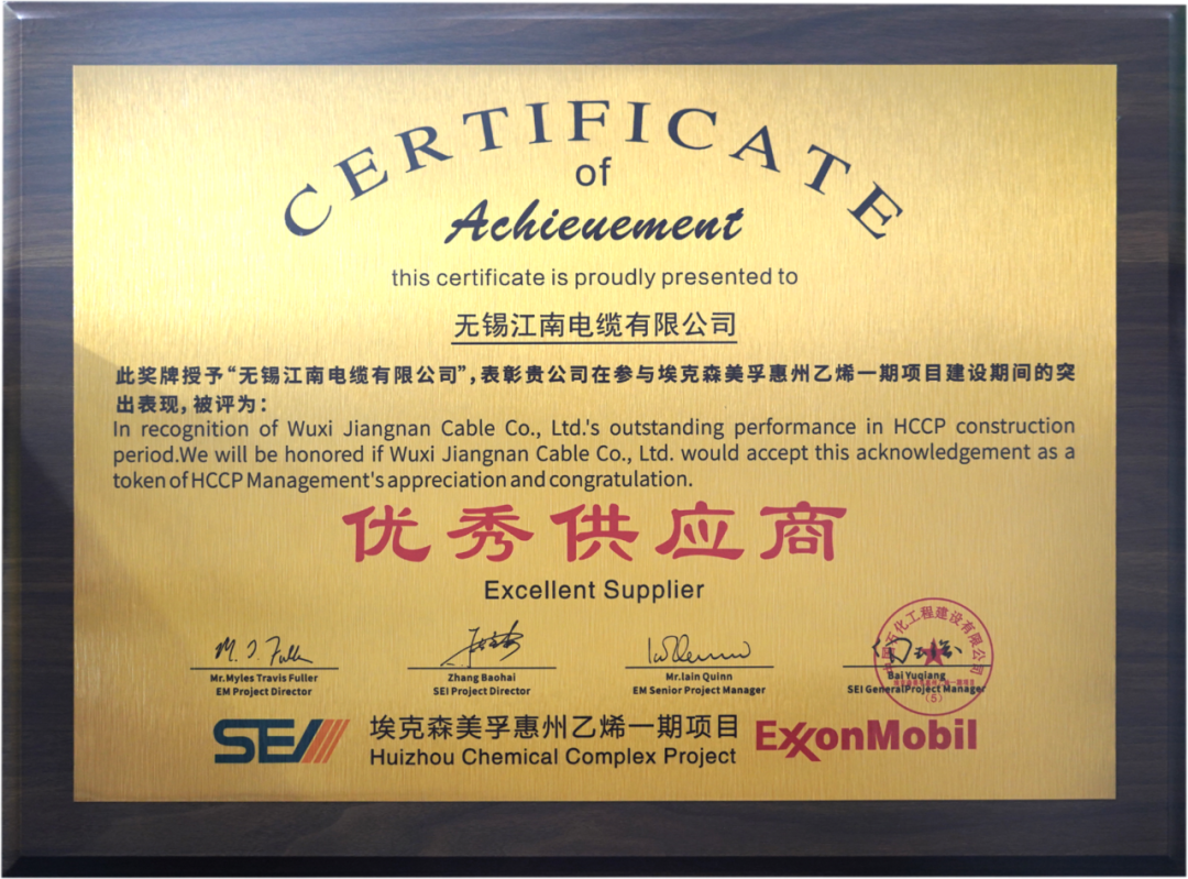 【荣耀时刻】江南电缆荣获埃克森美孚优秀供应商!