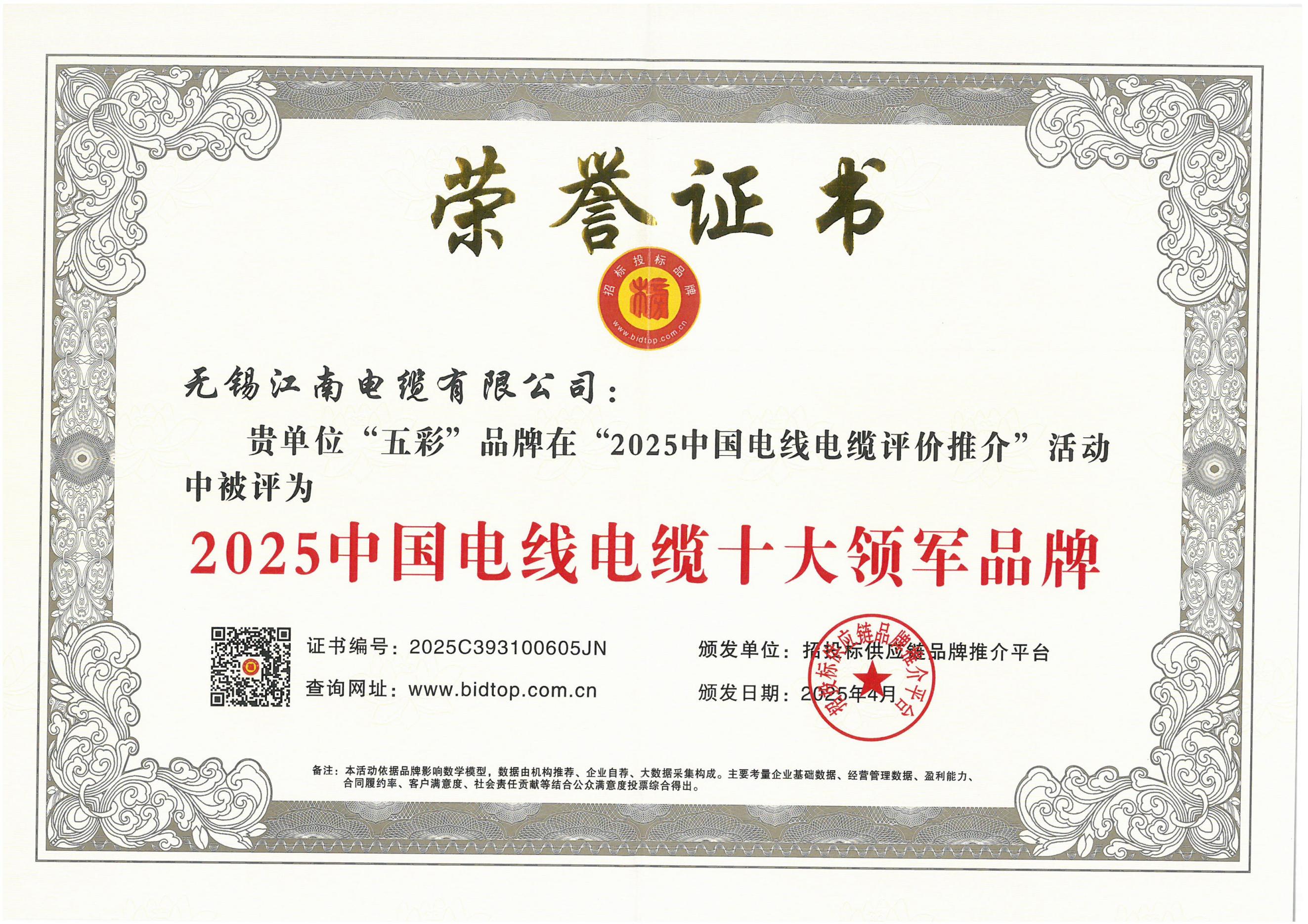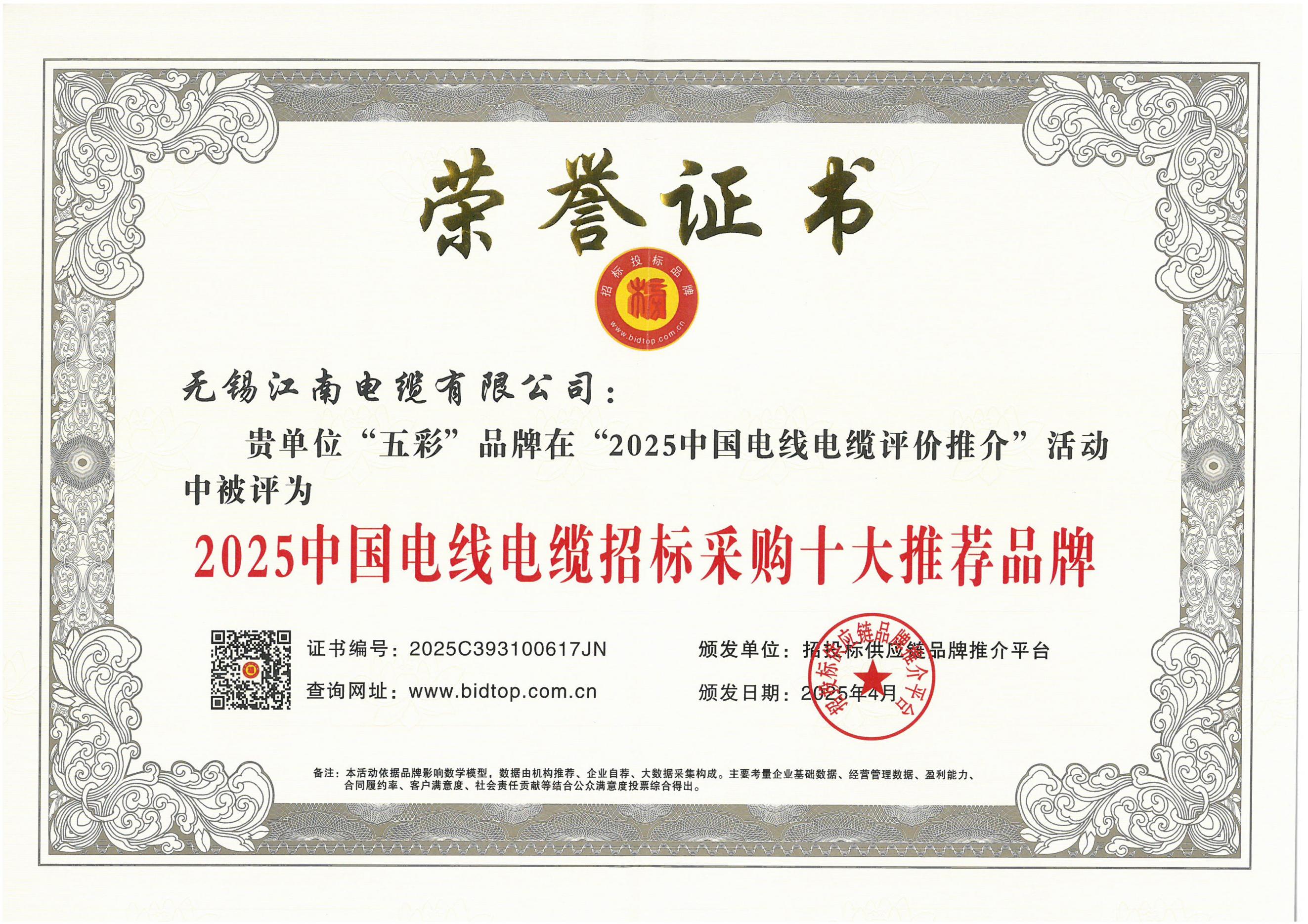 近日,由招投标供应链品牌推介平台举办的“2025中国电线电缆评价推介”活动圆满结束,江南电缆荣获2025中国“电线电缆十大品牌”、“电线电缆十大领军品牌”“电线电缆招标采购十大推荐品牌”等荣誉。