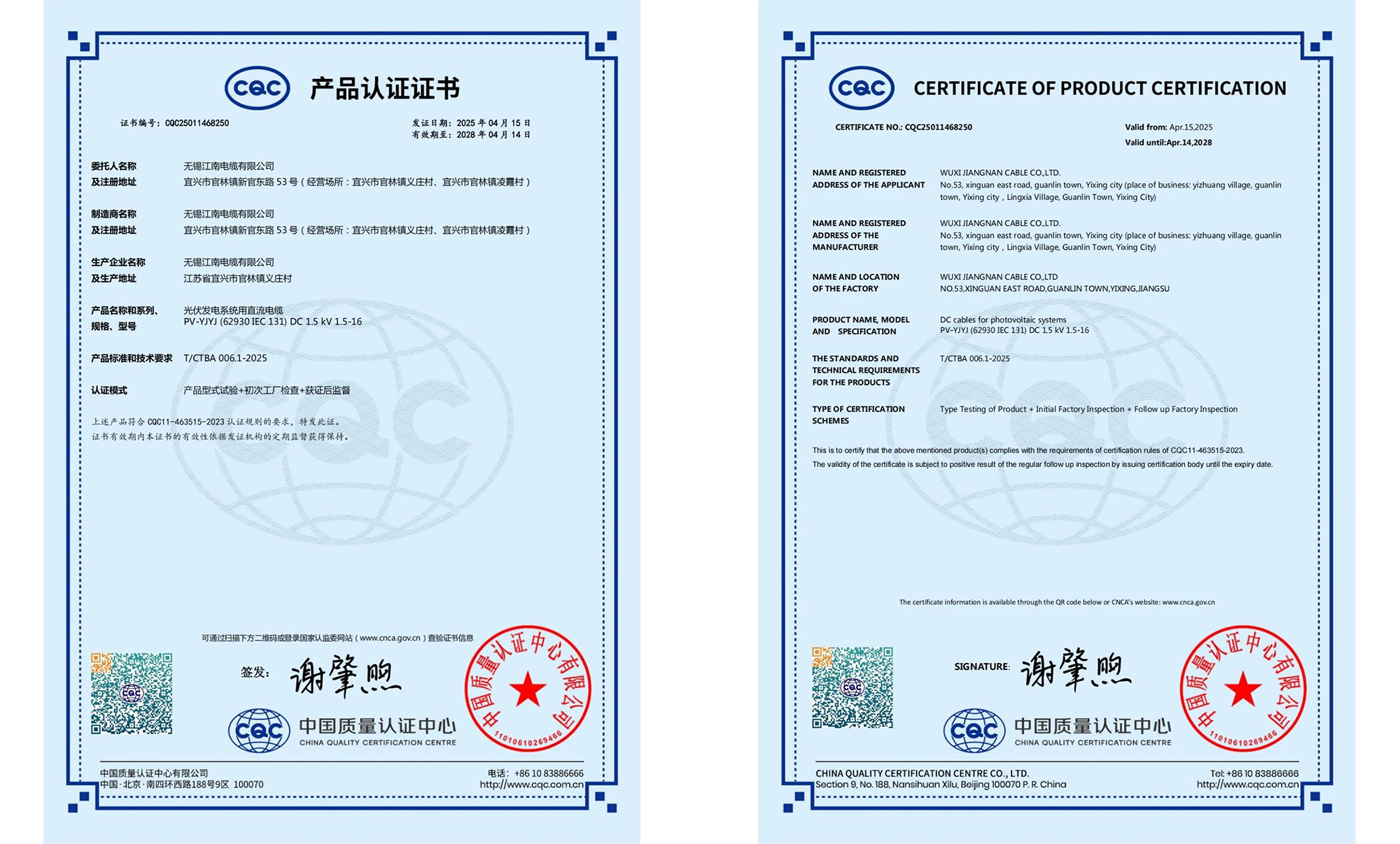 4月18日,江南电缆顺利取得CQC颁发的首批光伏发电系统用直流电缆PV-YJYJ (62930 IEC131)DC 1.5kV 1.5-16mm² 认证证书。