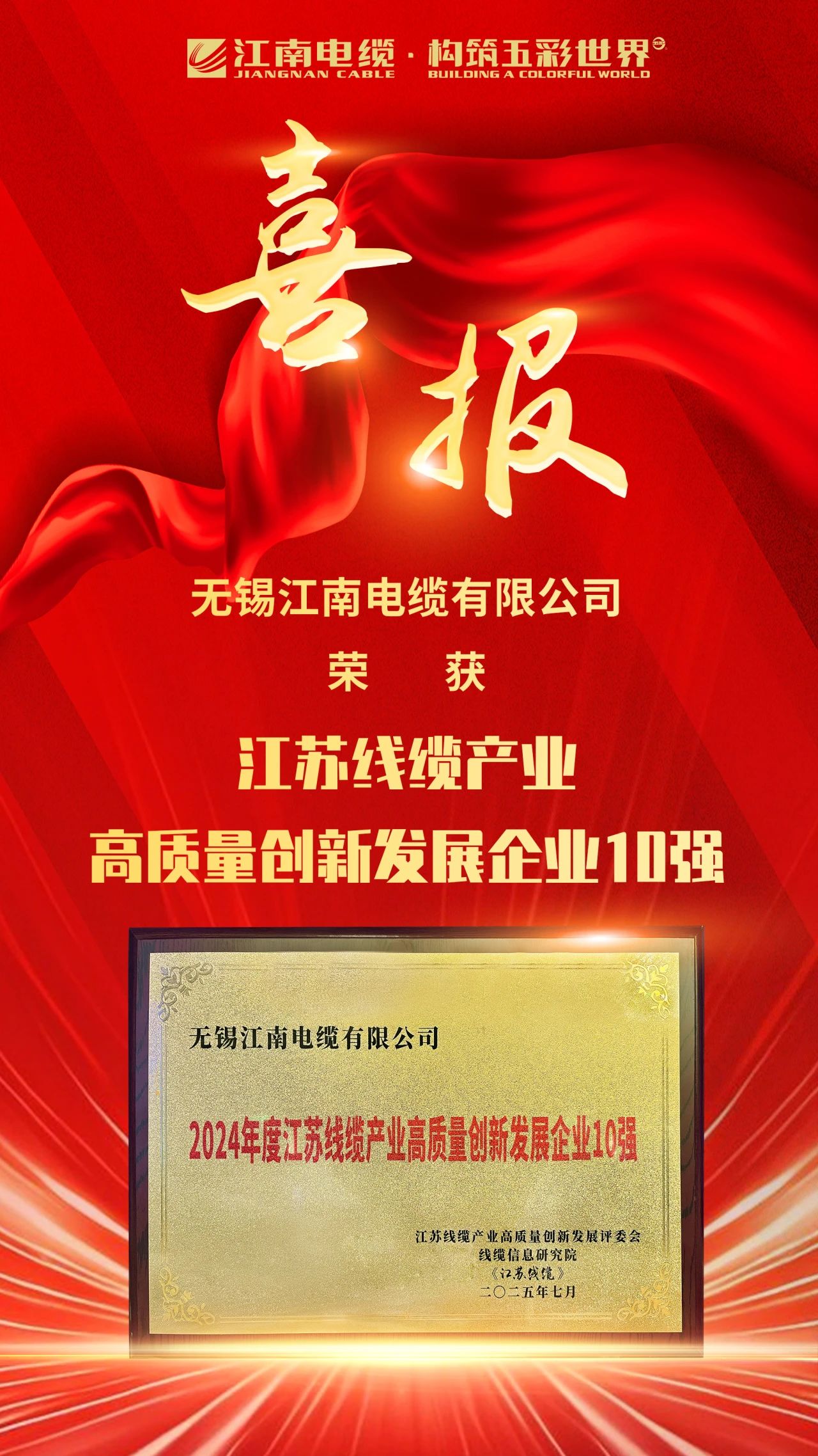 7月25日,江苏省线缆行业高质量发展峰会在南通隆重召开,会议发布了“江苏线缆产业高质量创新发展企业10强”、江苏省电线电缆行业2024年度“科技尖兵/杰出工匠/优秀经理”等榜单。