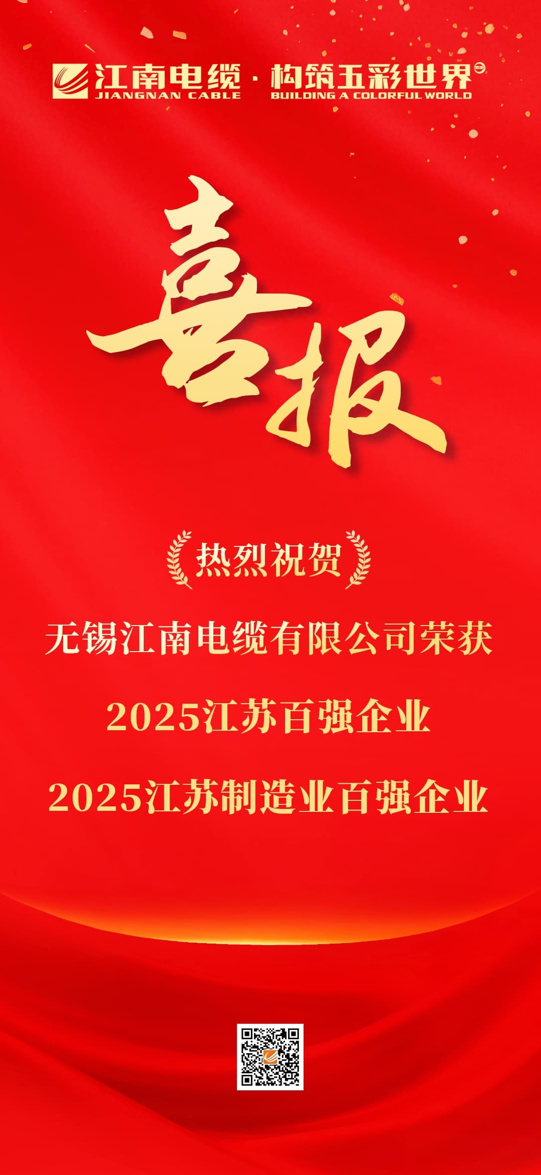 【喜报】江南电缆荣获2025江苏百强企业、2025江苏制造业百强企业!