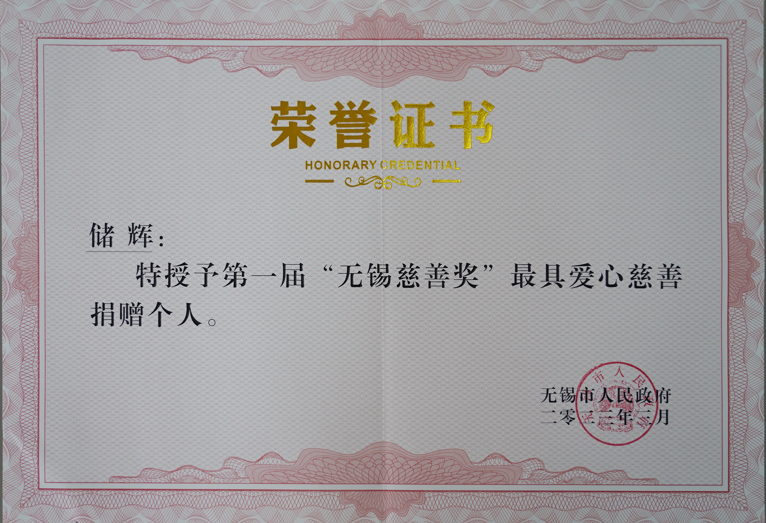 董事局主席储辉被无锡市人民政府授予“无锡慈善奖”最具爱心慈善捐赠个人