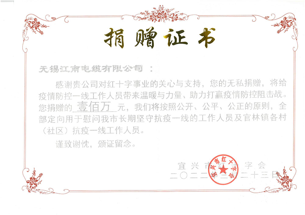 公益慈善/向宜兴红十字会捐赠100万—关心、关爱长期坚守抗疫一线工作人员