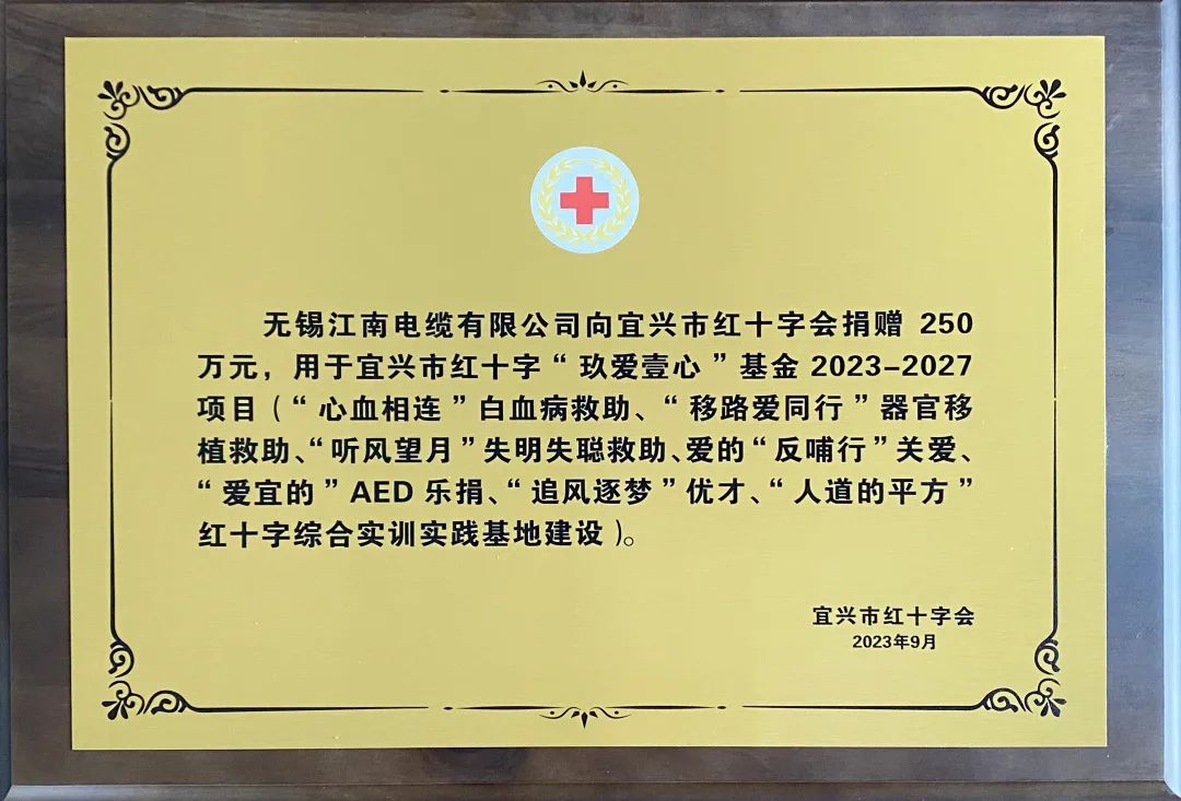 慈善始于心,行善贵有恒。江南电缆始终围绕扶危济困、抢险救灾、捐资助学、助老助残、卫生医疗、乡村振兴等方面,开展常态化、专业化、多样化的公益慈善活动。在完成宜兴市红十字“玖爱壹心”基金项目,救助失独家庭、伤残特困家庭275户,困难家庭165户的同时,又开启了新一轮“玖爱壹心”项目,助力崇高的慈善事业迈向新高峰。