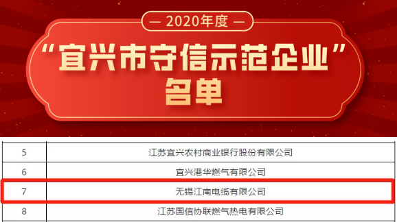 江南电缆荣获2020年度“宜兴市守信示范企业”