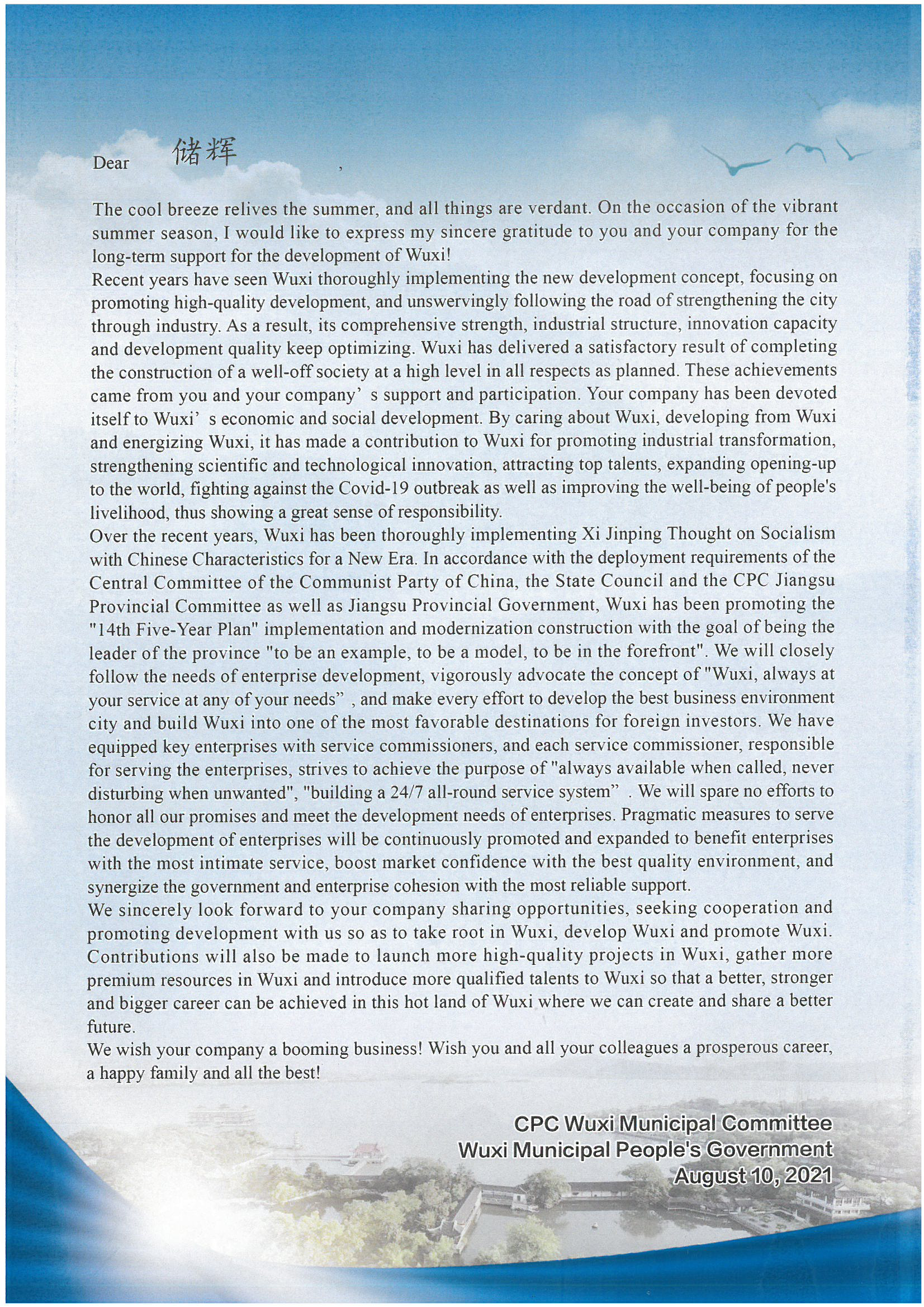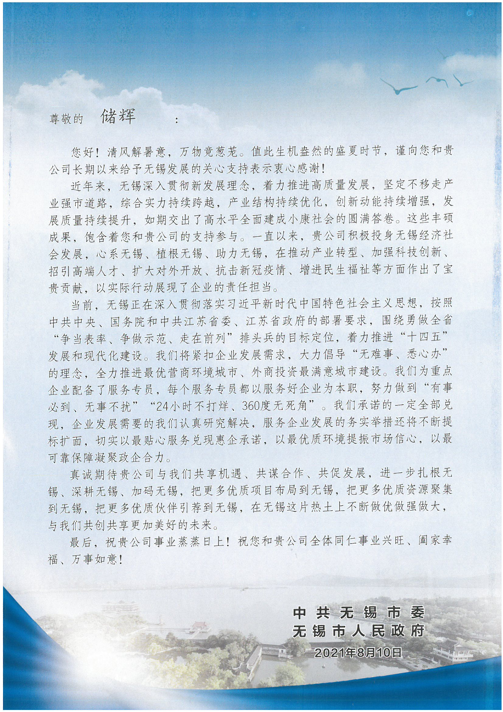 【关怀·振奋】无锡市委、市政府致江南集团董事局主席储辉先生的一封信!