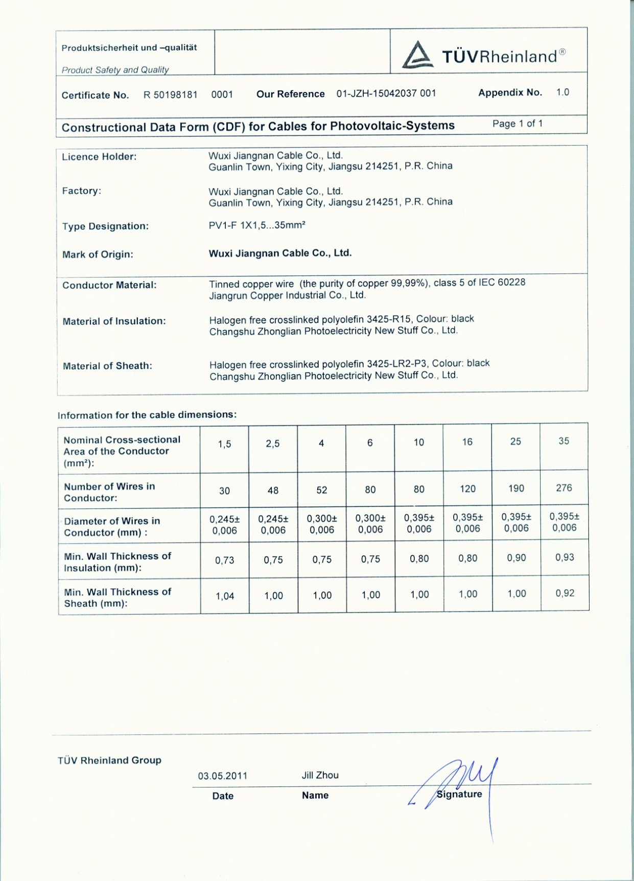 2PfG 1169/08.2007适用于最高允许1.8kV(线芯对线芯,非接地系统)直流电压、在光伏系统中DC侧(光伏装置中从光伏电池到光伏换流器直流端子之间的部分)使用的单芯软电缆(电线),该产品适合于Ⅱ类安全等级下使用,电缆可以多根并联使用。